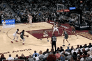 NBA常规赛,热火主场迎战尼克斯的比赛正在进行中。比赛的第二节,阿德巴约底角接球,迎着唐斯防守三分投进。